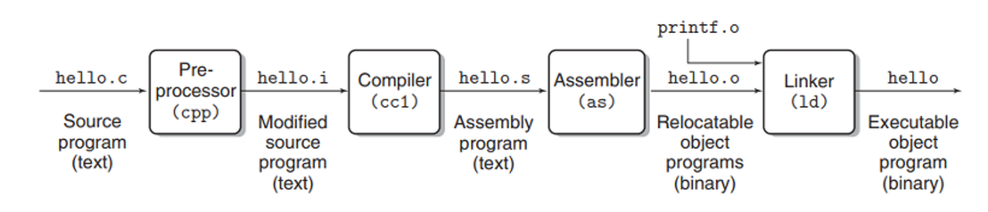 소스 코드를 실행 파일로 만들기 위해 네 가지 과정을 거친다.