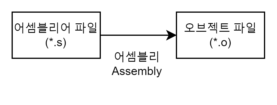 어셈블러(Assembler)를 통해 어셈블리어 파일(*.s)을 오브젝트 파일(*.o)로 변환하는 과정이다.