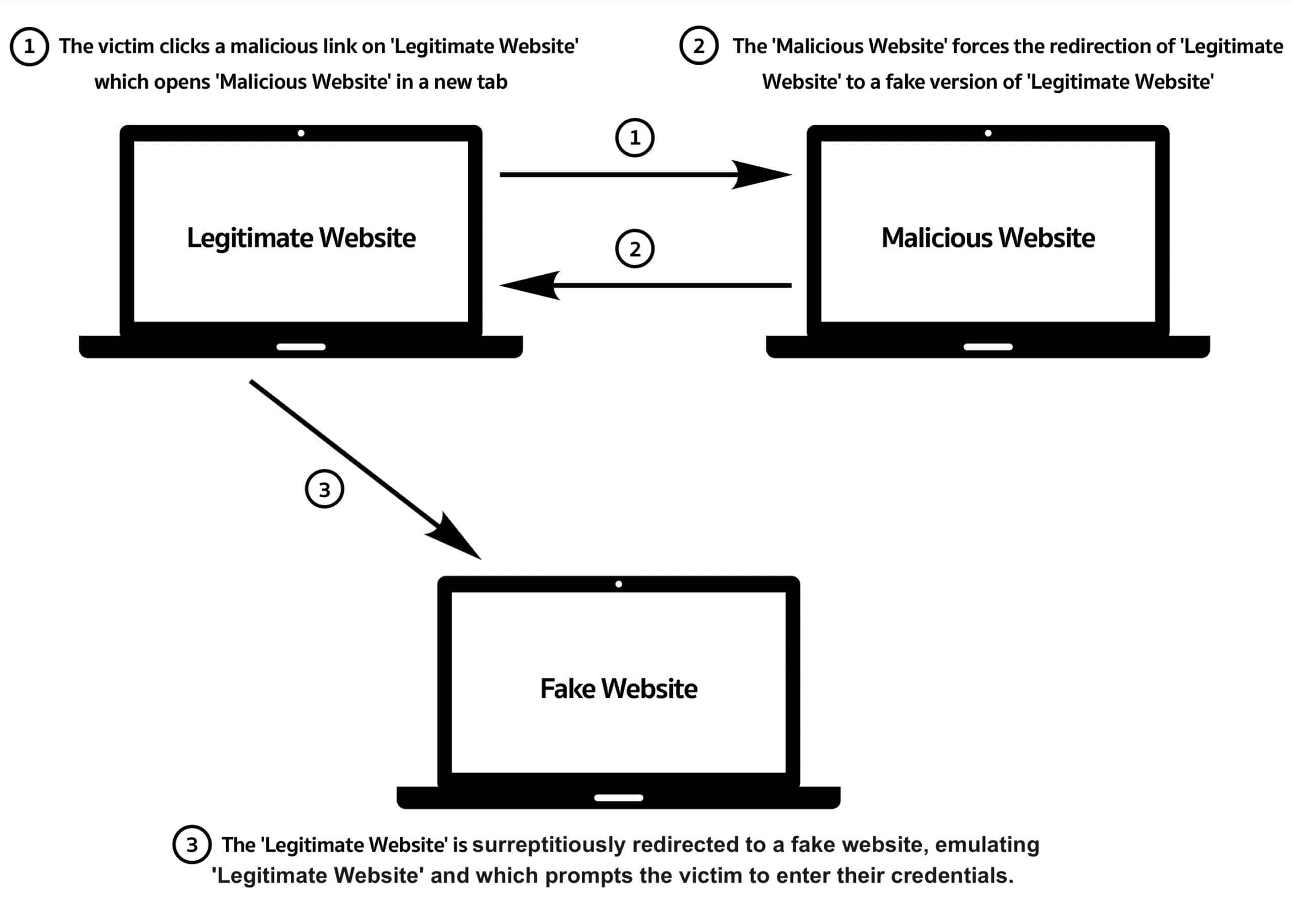 은 사용자의 원래 탭을 피해자가 열었던 웹사이트에서 나온 것처럼 보이는 가짜 로그인 페이지로 리디렉션한다. 예를 들어 사용자가 Facebook에 로그인되어 있으면, 공격자는 Facebook의 실제 로그인 페이지처럼 보이도록 가짜 로그인 페이지를 보여준다.