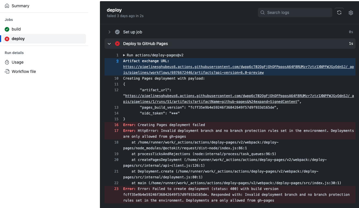 Error: Creating Pages deployment failed Error: HttpError: Invalid deployment branch and no branch protection rules set in the environment. Deployments are only allowed from gh-pages