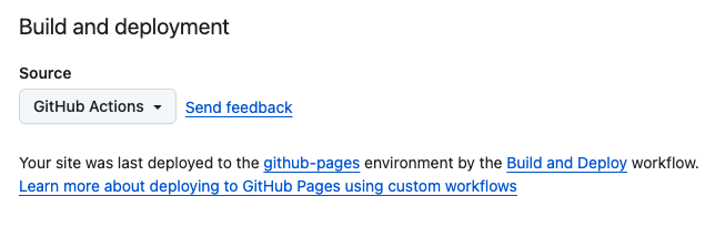 Settings > Pages > Build and deployment > Source: GitHub Actions